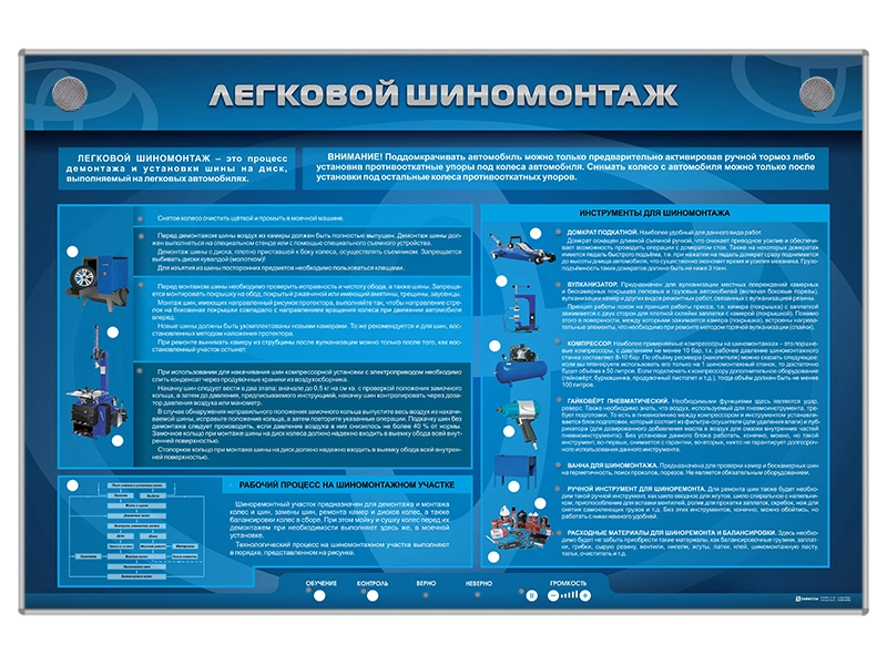 Электрифицированный стенд должен быть предназначен для информирования учащихся об основных видах и объеме работ по шиномонтажу легковых автомобилей.