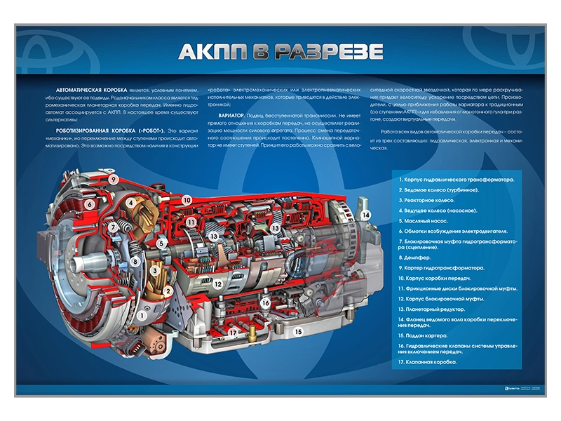 Стенд представляет собой информационную панель, на которой размещены сведения о конструкции автоматической коробки переключения передач автомобиля, содержащие изображение автоматической коробки переключения передач автомобиля в разрезе.