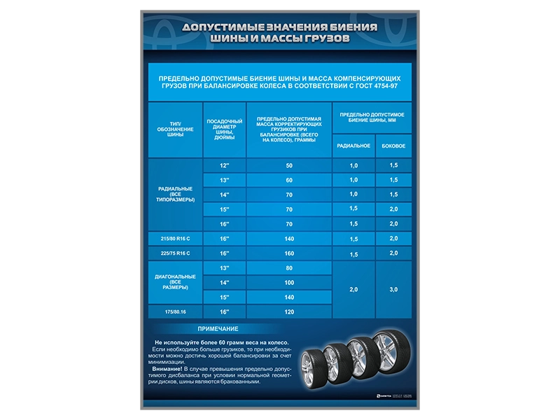 Стенд представляет собой информационную панель с табличной информацией о допустимых значениях биения шины и массах грузов, регламентированных ГОСТ 4754-97.