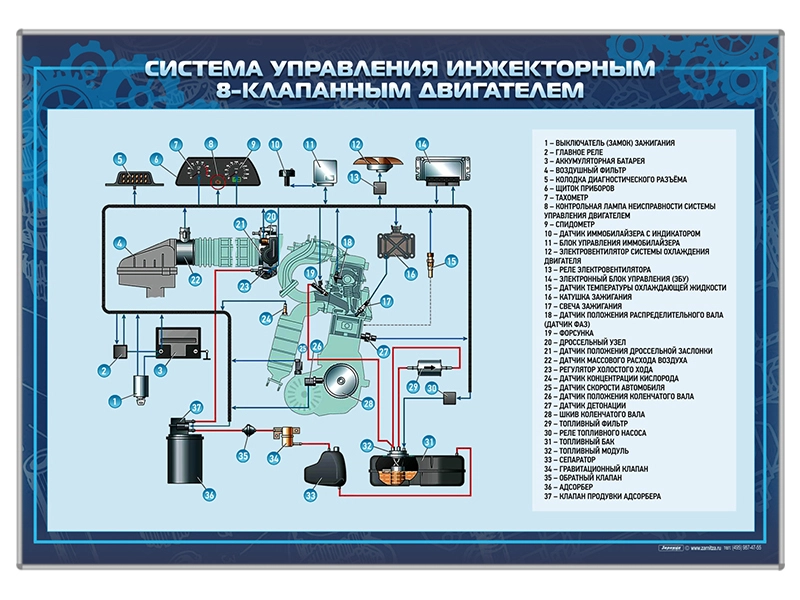 Стенд представляет собой информационную панель, на которой размещены сведения об общем устройстве и принципе работы системы управления инжекторным 8-ми клапанным двигателем автомобиля, содержащие схему системы с перечнем оборудования.
