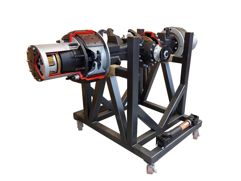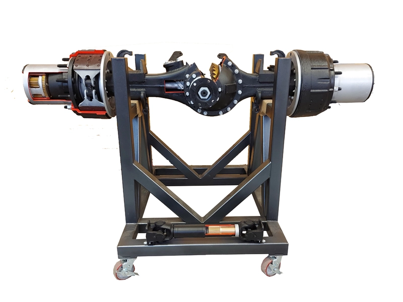 Стенд представляет собой оригинальный задний мост в сборе с тормозными механизмами и фрагментом карданной передачи в разрезе, серийно устанавливаемый на грузовые автомобили марки КАМАЗ. Размещен на подставке напольного исполнения, покрытой защитной порошковой эмалью и оснащенной четырьмя подвижными колесами с фиксаторами. Стенд предназначен для проведения комплекса практических работ по изучению конструкции заднего моста грузовых автомобилей марки КАМАЗ, принципов их функционирования и режимов работы, а также формированию первоначальных навыков по техническому обслуживанию и ремонту автомобиля в курсах "Устройство автомобильной техники", "Эксплуатация автомобильной техники", "Конструкция и расчет автомобильной техники".