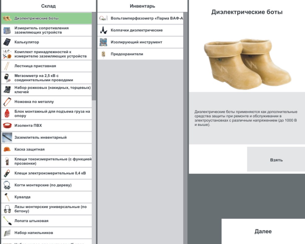 Этап 2. Выбор необходимых для работы инструментов: отбор нужного снаряжения и инструментов в инвентарь персонажа.