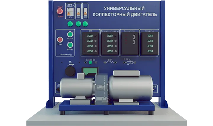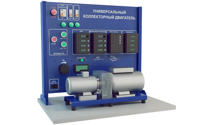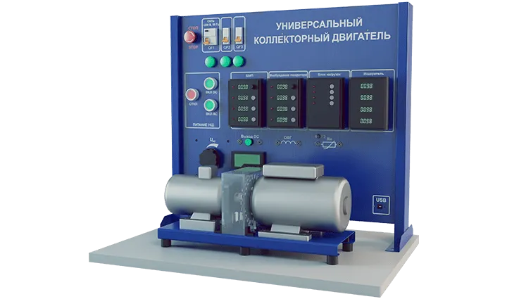 Лабораторная установка по изучению универсального коллекторного двигателя позволяет студентам погрузиться в принципы работы электромоторов через практические эксперименты. Устройство демонстрирует работу электромагнитных полей, коммутации и механической энергии, способствуя глубокому пониманию физики электричества.