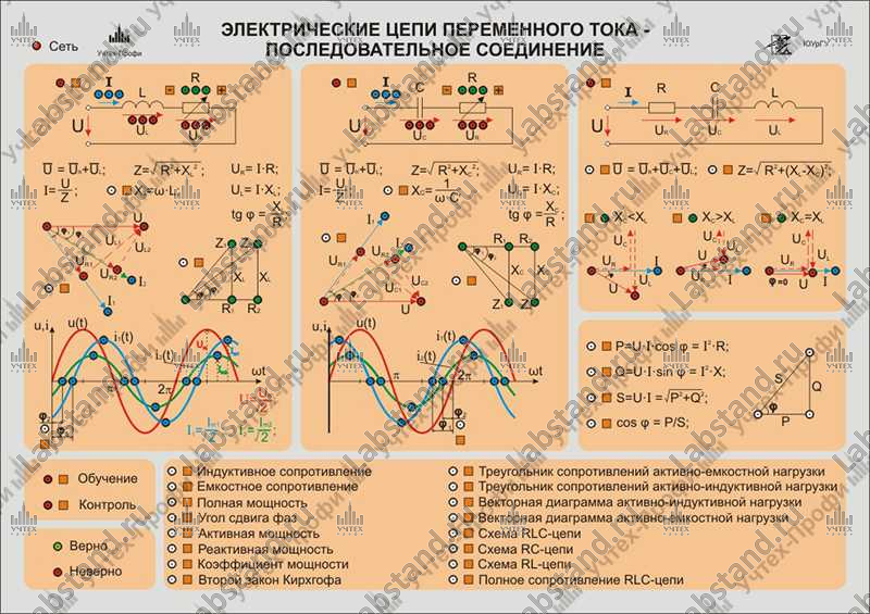 – планшет светодинамический, содержащий: элементы управления; схему замещения, осциллограммы, векторные диаграммы и основные формулы RL-цепи с регулируемым активным сопротивлением; схему замещения, осциллограммы, векторные диаграммы и основные формулы RC-цепи с регулируемым активным сопротивлением; схему замещения, осциллограммы, векторные диаграммы и основные формулы RLC-цепи; треугольник мощностей с соответствующими выражениями; контрольные вопросы (не менее 16 шт.);