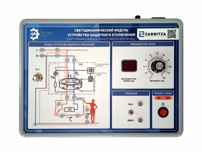 Светодинамический модуль предназначен для изучения принципа работы устройства защитного отключения (УЗО).