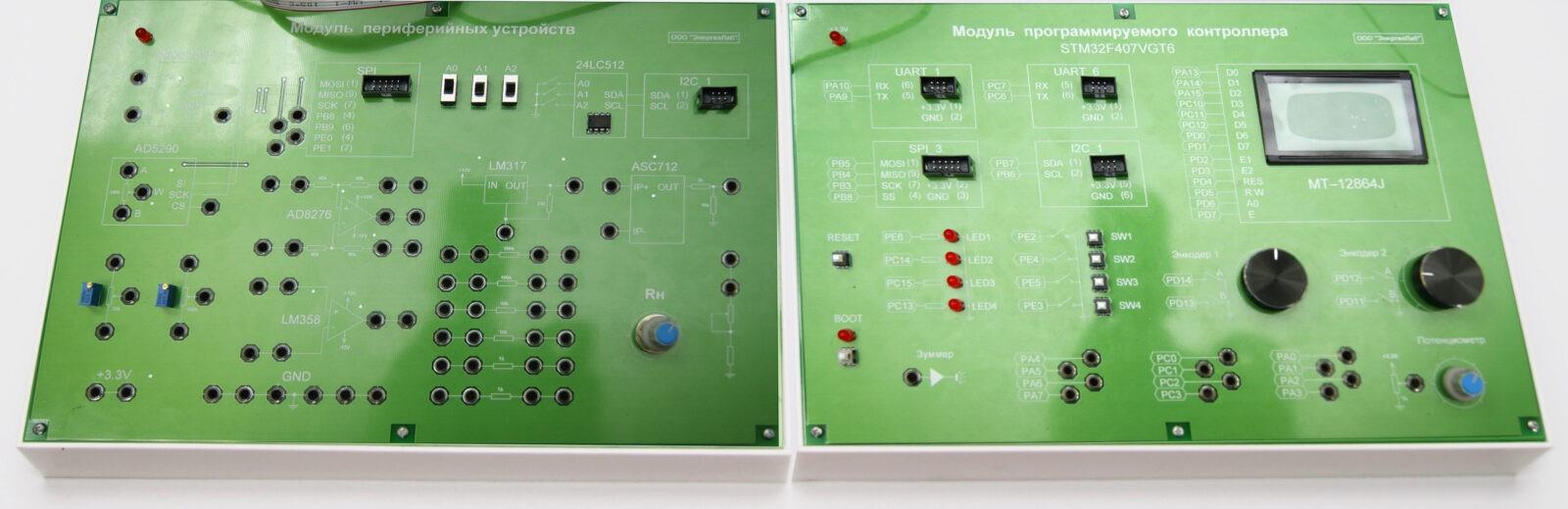 Учебное оборудование состоит из двух модулей. Модули подключаются между собой специальным кабелей идущим в комплекте.
