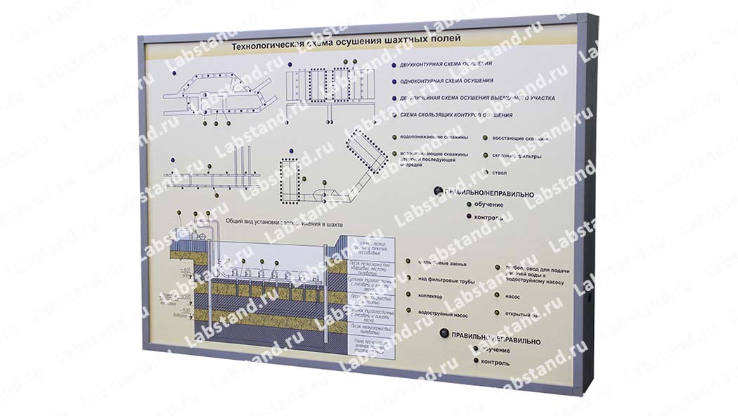 Описание: Стенд представляет собой жёсткую лицевую панель из МДФ толщиной 8 мм, в пластиковом каркасе толщиной 90 мм. На лицевую панель наклеена полимерная подложка с цветным изображением технологической схемы осушения шахтных полей. Внутри каркаса расположен контроллер управления логикой стенда. С целью наглядной иллюстрации принципа работы схемы в лицевой панели установлены динамическая светодиодная подсветка и магнитные сенсоры для реализации режимов «обучения» и «контроля». В режиме «обучения» при выделении одного из элементов технологической схемы загорается светодиод напротив соответствующего наименования элемента. В режиме «контроля» учащийся должен сам сопоставить наименование элемента с его изображением на технологической схеме.