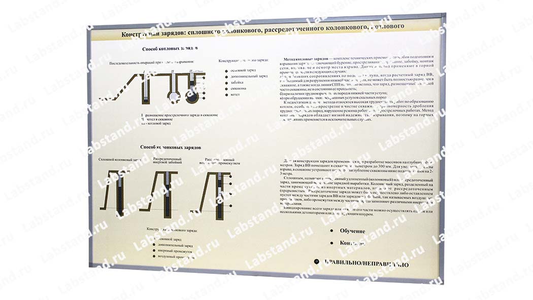 Назначение: Светодинамический стенд-планшет «Конструкции зарядов: сплошного колонкового, рассредоточенного колонкового, котлового» предназначен для освоения различных способов подрыва взрывчатых веществ, их назначения и принципа действия в профильных учебных заведениях.