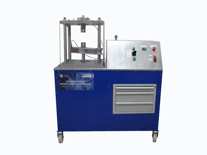 Оборудование представляет собой специализированный металлический стол с ящиками для хранения сменных элементов и отсеком с гидростанцией, на столешнице которого смонтирован гидравлический пресс с системой измерения усилия и перемещения подвижной траверсы, обеспечивающей передачу измеренного усилия и перемещения с помощью модуля измерения на ноутбук, где формируются диаграммы по измеряемым параметрам.