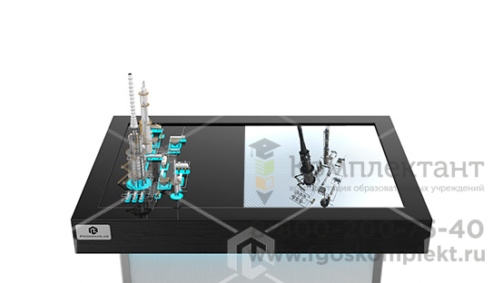 Стационарный интерактивный макет на мобильной платформе позволяет изучать последовательность и логистику технологических процессов установки изомеризации с возможностью сенсорного ввода и управления, отображать трехмерные разрезы выбранного элемента оборудования на дисплее макета.