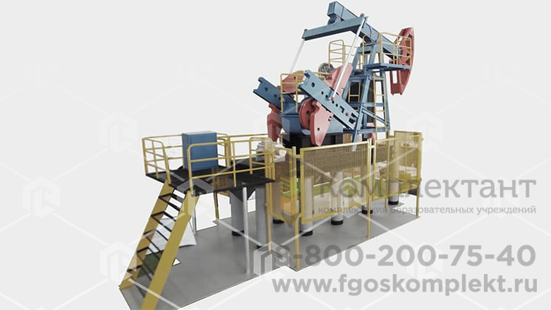 Макет установки штангового глубинного насоса выполнен из профессиональных листовых и легкообрабатываемых материалов с применением технологий FDM и SLA печати, отдельные элементы созданы на ЧПУ станках, позволяет наглядно изучить устройство и элементы установки штангового глубинного насоса, содержит экспликацию оборудования.