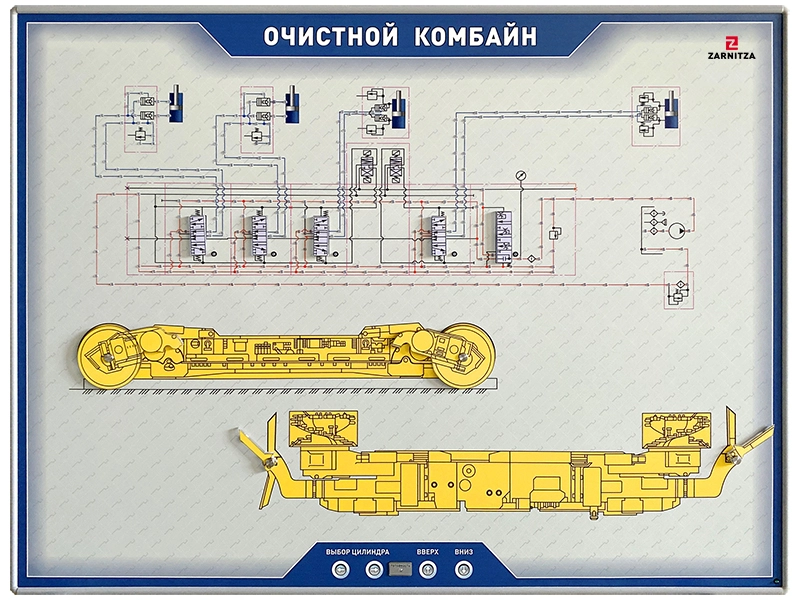 Стенд представляет собой жёсткое основание с цветным изображением принципиальной гидравлической схемы и общего вида очистного комбайна. Для наглядной иллюстрации принципа действия установлены светодиоды и подвижные макеты основных органов управления и исполнительных механизмов.