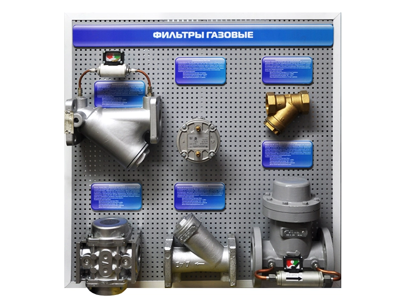 Учебное оборудование представляет собой стенд с расположенными на нем различными типами газовых фильтров с краткими техническими характеристиками.