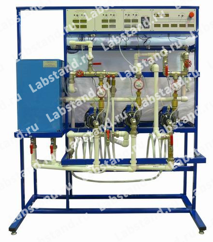 Напольное исполнение стенда. Состав стенда: рамная конструкция с приборной панелью, технологический бак, три центробежных насоса (качающий блок: пластик и нержавеющая сталь), систему трубопроводов и кранов, бак для рабочей жидкости (вода), частотный регулятор для управления частотой вращения вала одного из насосов; расходомер для измерения расхода с электронным выходом на цифровое табло, датчики абсолютного давления с цифровым выходом для измерения величин давления на выходах и всасывании насосов.