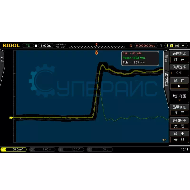 Режимы триггера | фронт, импульс, видео (NTSC,PAL,SECAM), рант, шаблон, N фронт, скорость нарастания, RS232/UART, I2C, SPI, USB, CAN, LIN, FlexRay |