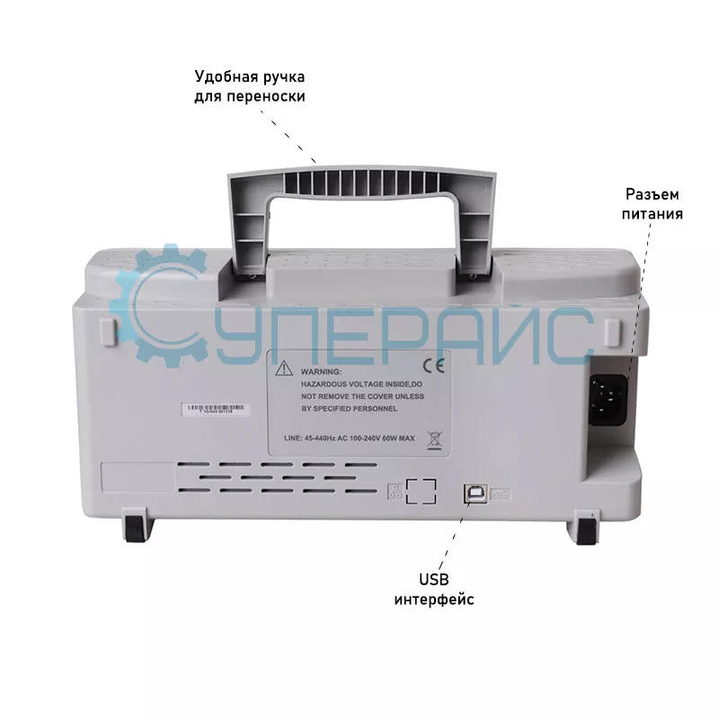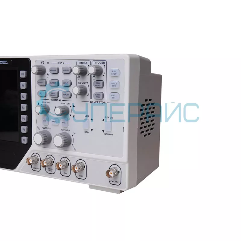 Устройство включает в себя одноканальный генератор сигналов с максимальной полосой пропускания 25 МГц. Глубина памяти составляет 2 Кбайт, 12-битное вертикальное разрешение и регулируемый ЦАП. Помимо генератора цифровой осциллограф имеет встроенный частотомер с высокой точностью и разрешением 6 цифр.