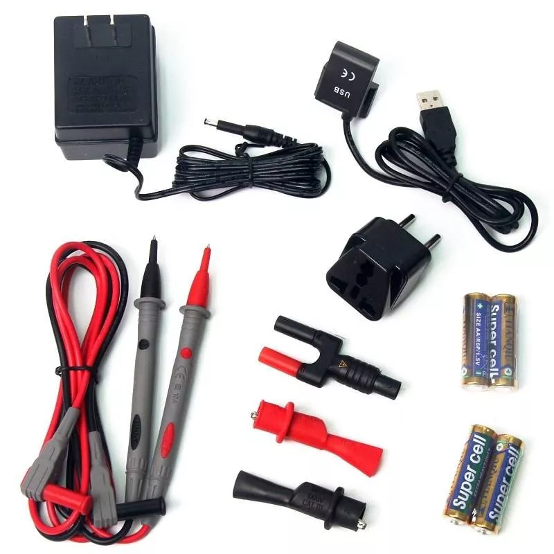 | измерительные щупы – 1 шт зажим "крокодил" – 1 шт кабель питания – 1 шт батареи 1,5 В(R6) – 4 шт кабель USB – 1 шт инструкция по эксплуатации – 1 шт |