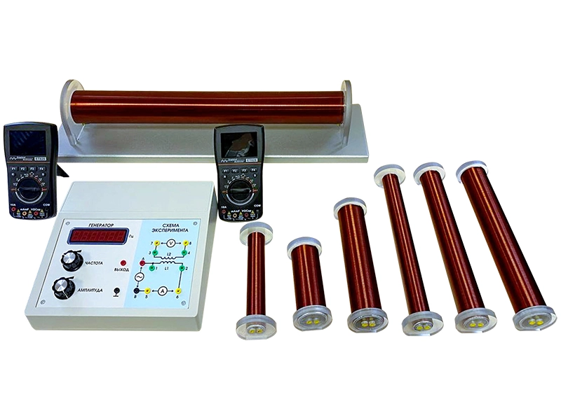 Лабораторная установка представляет собой набор, состоящий из основной катушки возбуждения, которая установлена на специальном основании, и набора различных типов индукционных катушек, выполненных таким образом, что могут помещаться внутрь основной катушки. На торцах катушек имеются гнезда, с помощью которых катушки можно соединять с генератором переменного тока и измерительными приборами установки, используя для этого соединительные провода. Набор индукционных катушек позволяет исследовать индукцию магнитного поля для катушек с различным числом витков (при одинаковом диаметре намотки), а также для катушек с одинаковым количеством витков (при различных диаметрах катушки). Измерение переменных токов и напряжений производится одновременно с помощью двух мультиметров. Установка частоты и амплитуды генерируемого тока производится с помощью соответствующих ручек на передней панели генератора.