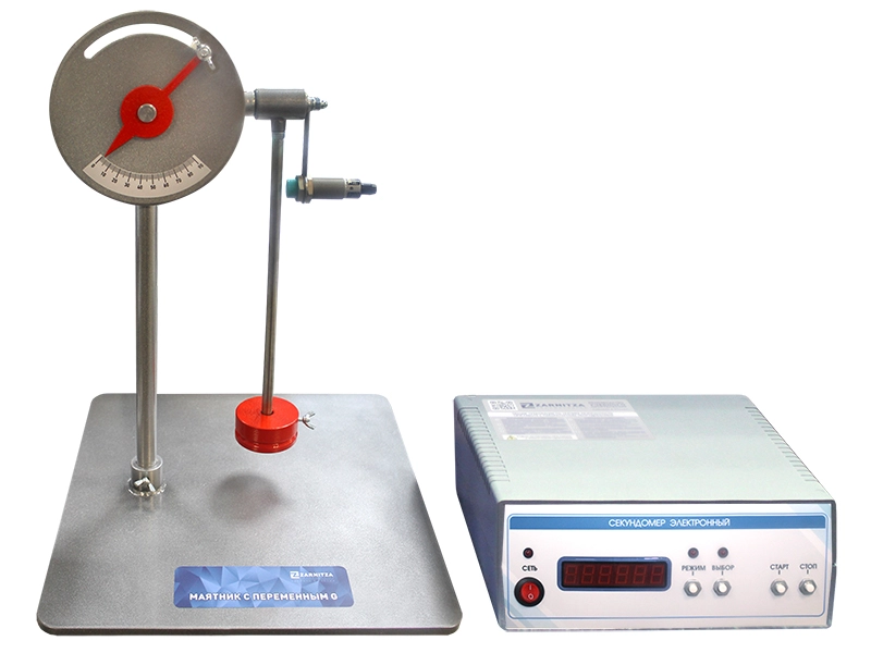 Оборудование конструктивно представляет собой установленную на неподвижном основании вертикальную стойку с закрепленным диском с градуированной угловой шкалой. На оси с изменяемым углом наклона подвижно закреплен маятник. Изменяя угол отклонения маятника от вертикального положения, с помощью цифрового секундомера и оптического датчика можно измерять изменение периода маятника.