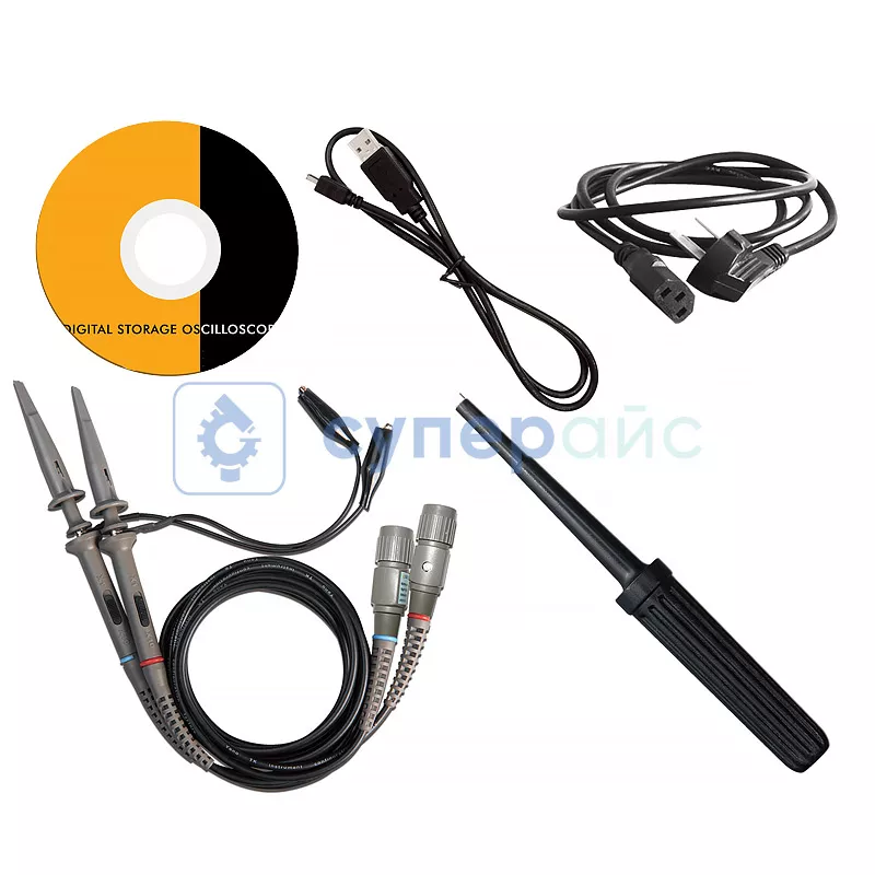 щупы для осциллографа - 2 шт регулировочная отвертка - 1 шт USB кабель - 1 шт кабель питания - 1 шт диск с ПО - 1 шт инструкция по эксплуатации - 1 шт |