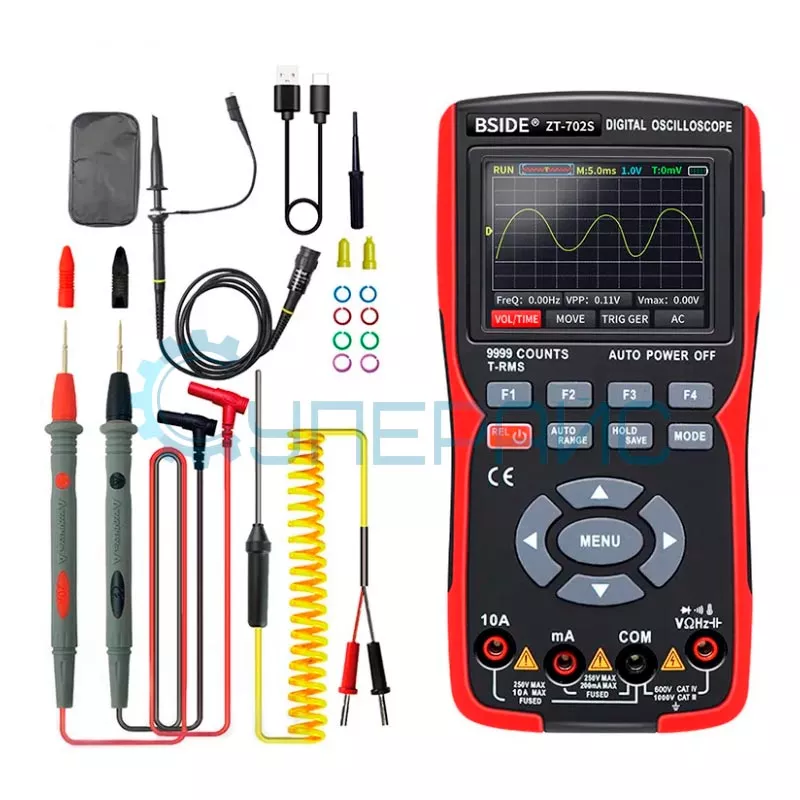 Устройство ZT 702S от компании BSIDE является универсальным измерительным инструментом, сочетающим функции осциллографа и мультиметра в одном корпусе. В комплект поставки входят щуп для осциллографа, щупы для мультиметра с иглами, чехол и другие рабочие принадлежности. Прибор обеспечивает анализ электрических сигналов, располагая полосой пропускания 10 МГц и скоростью выборки 48 Мвыб/с, что гарантирует детальное изучение электрических параметров.