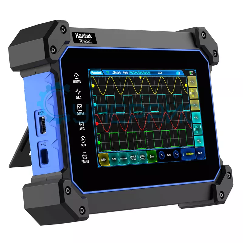 Hantek TO1252C оснащён встроенным мультиметром, а также дисплеем для наглядного отображения данных: пользователь может легко анализировать и интерпретировать результаты проводимых исследований. Интерфейс TO1252C даёт возможность быстро передавать данные с прибора на внешние устройства при помощи нескольких разъёмов, включая USB Type-C. Функционал модели включает вертикальную и горизонтальную системы, а также систему синхронизации. Доступен сбор сигналов в двух режимах: непосредственно сбора, а также выборки. Устройство можно запускать по видео-сигналу, истечению времени, а также другим параметрам. Кроме того, возможны курсорные и автоматические измерения, предусмотрены математические операции, включая быстрое преобразование Фурье.