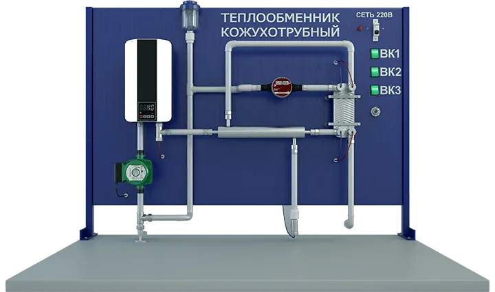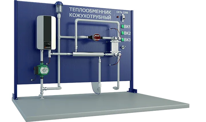 Лабораторная установка для испытания различных конструкций теплообменных аппаратов: кожухотрубный и пластинчатый. Изучайте принципы работы теплообмена с помощью современного оборудования, подходящего для образовательных целей.