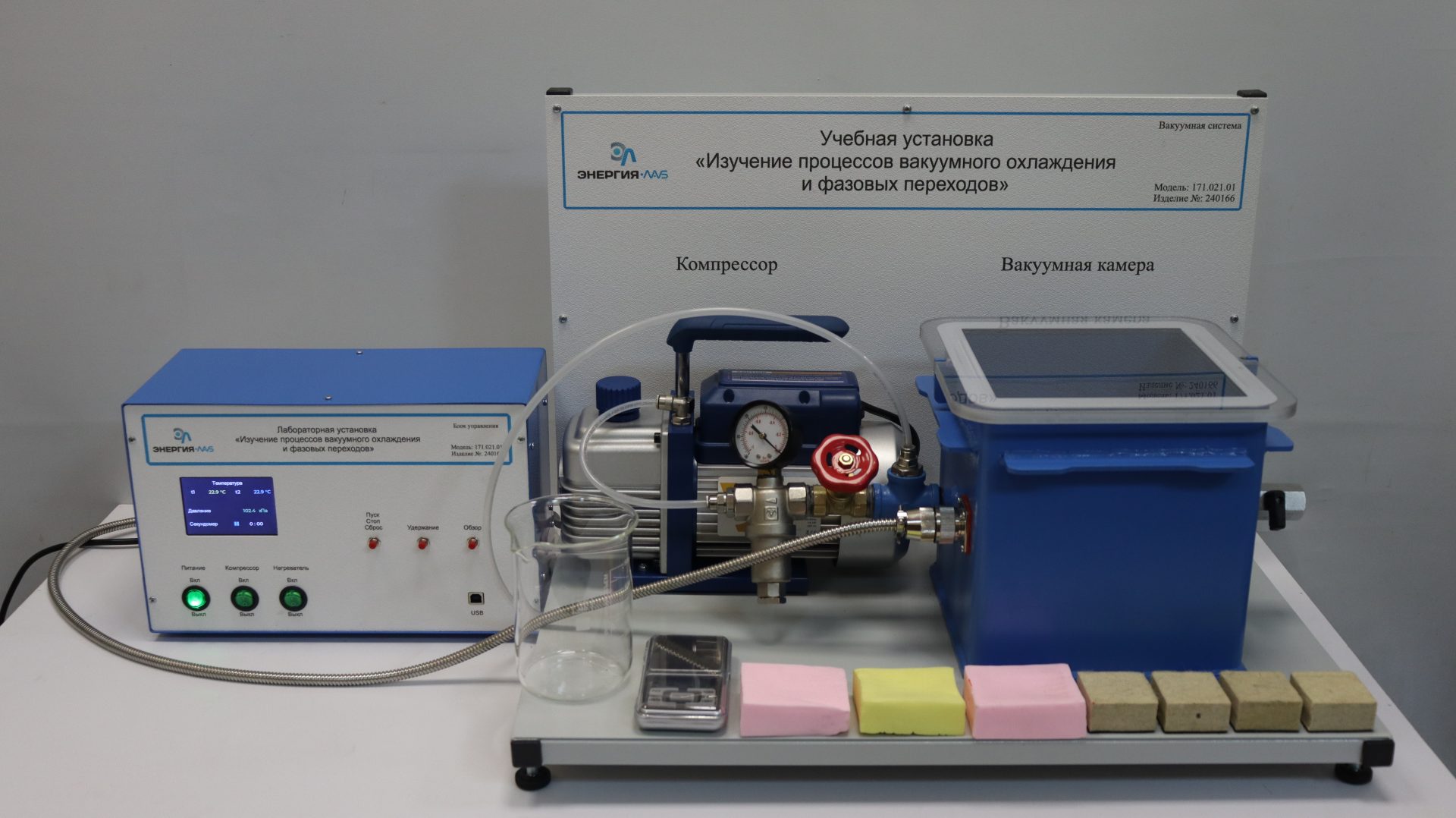 Учебная лабораторная установка «Изучение процессов вакуумного охлаждения и фазовых переходов» предназначена для проведения лабораторных работ по курсам изучения дисциплин «Физика».