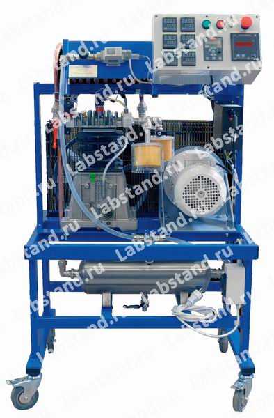 Стенд напольный для изучения характеристик поршневого компрессора. В составе: действующий поршневой компрессор; блок питания; электронный блок управления; тахометр; расходомер, датчики давления, температуры, частот вращения, платы согласования с компьютером, ноутбук. Результаты измерения параметров статических и динамических процессов обрабатываются компьютером. Результаты измерения статических процессов, кроме того, отображаются на цифровых индикаторах.
