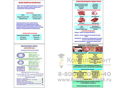 Плакаты ПРОФТЕХ «Классификации и виды мяса» (4 шт., винил, 70х100) – наглядное пособие для изучения различных видов мяса в образовательных учреждениях. Идеально подходит для демонстрации и обучения студентов аспектам пищевой промышленности и ветеринарии.