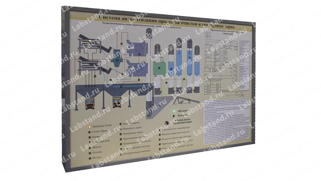 Назначение: Стенд-планшет предназначен для изучения системы автоматизации процессов очистки и сортировки зерна.