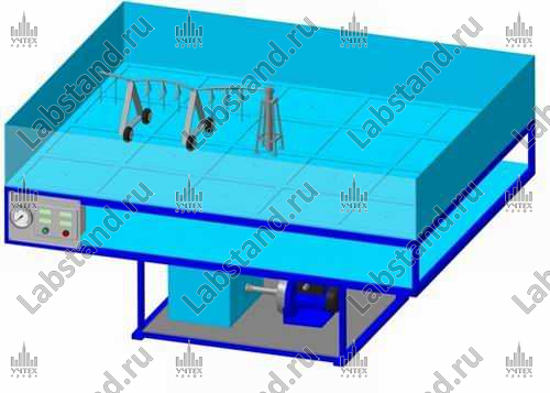 Состав: рамная конструкция, поддон с прозрачной крышкой и перфорированным дном для сбора распыляемой воды, модель системы орошения полей кругового типа с двумя самоходными стойками, бак для воды, насос, регулирующие задвижки, манометр, расходомер, мерные стаканы для установки под поддон (для измерения количества воды на единицу площади).