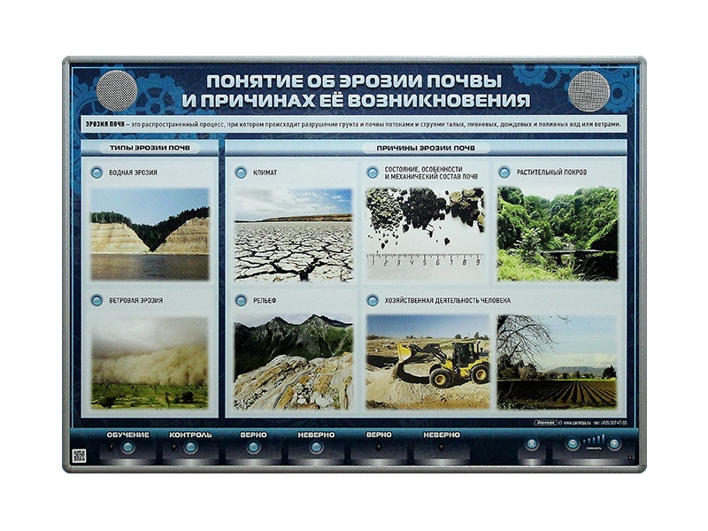 Электрифицированный стенд представляет собой информационную панель с раздельной световой индикацией. На стенде представлены полноцветные изображение, отображающее основные понятия об эрозии почвы и причинах её возникновения. В конструкцию учебного оборудования интегрированы сенсоры с датчиками, настроенными на касание руки человека, для управления стендом при помощи воздействия приемо-передающих устройств.