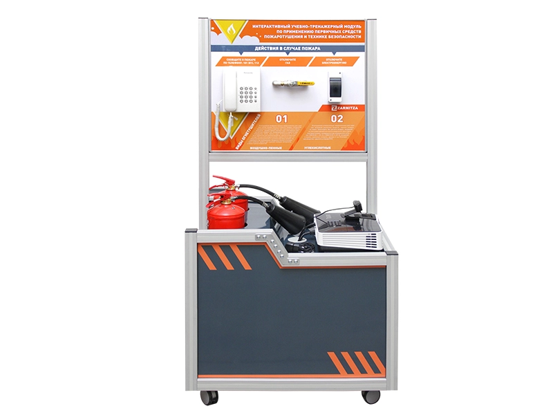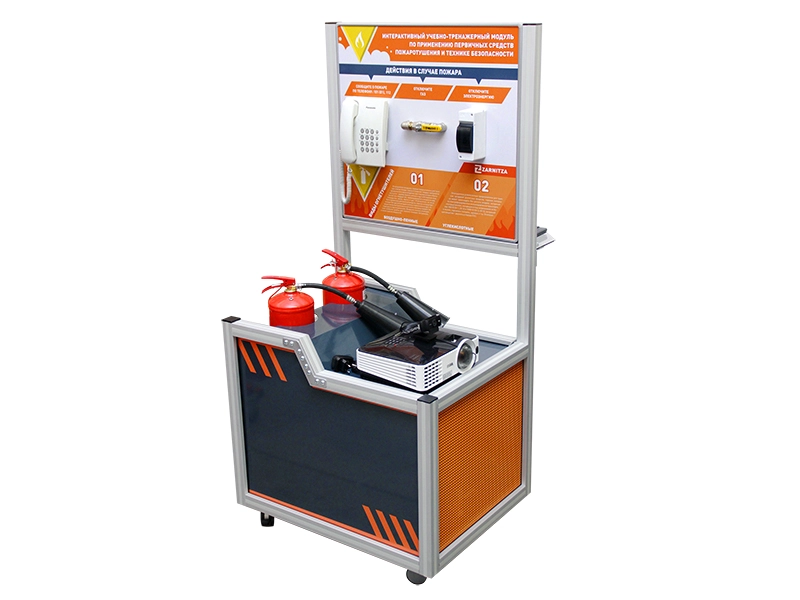 Аппаратно-программный комплекс представляет собой комплекс, состоящий из стойки с оборудованием, стойки с проекционным экраном и беспроводного пульта дистанционного управления инструктора. Стойка с оборудованием включает в себя: модели огнетушителей, мультимедийный видеопроектор, системный блок с лицензионным программным обеспечением, акустическую систему.