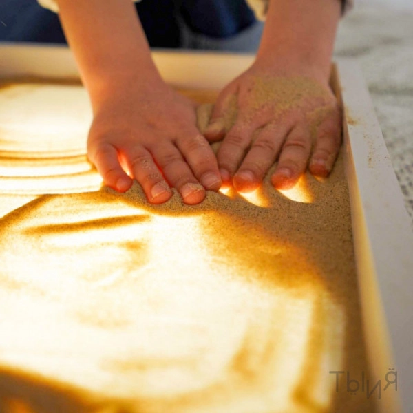 Световой-планшет, песок, подсветка, яркий корпус, отсек для инструментов и песка.
