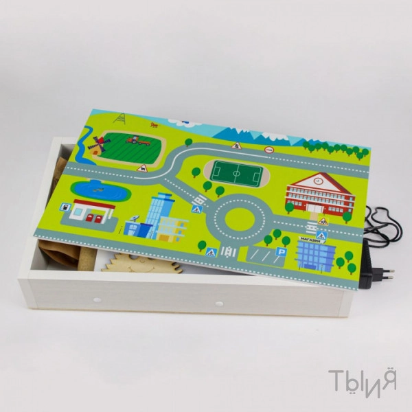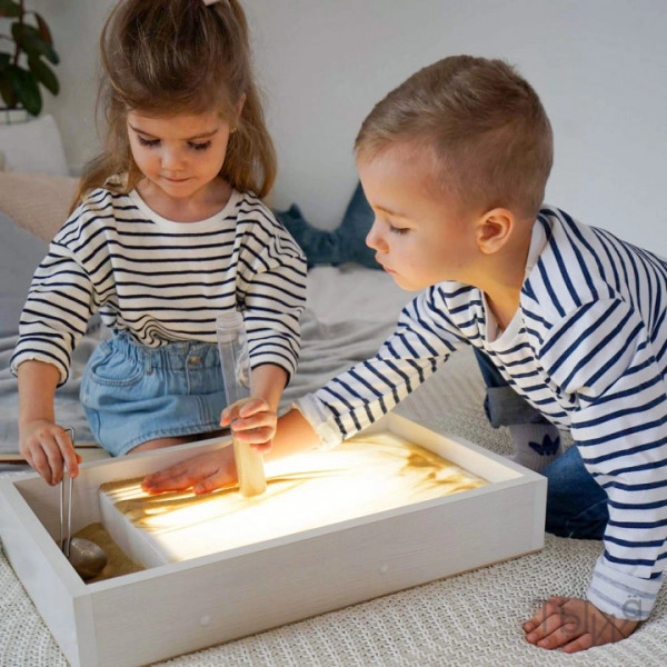 В комплекте: световой планшет, крышка, песок, подсветка, яркий корпус, отсек для инструментов и песка.