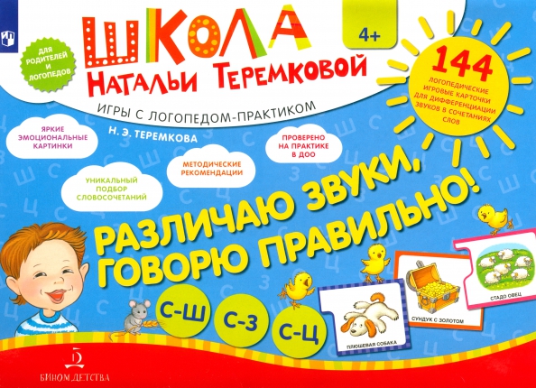 В этом поможет комплект игровых разрезных карточек «Школа Натальи Теремковой» — уникальный материал для игровых занятий с ребенком по дифференциации (различения) часто смешиваемых звуков в речи. Вам не нужно думать, какие тетради и пособия подобрать, чтобы правильно организовать обучение малыша. Каждый альбом серии «Различаю звуки, говорю правильно!», который входит в «Школу» — лучшее решение для автоматизации (закрепления) употребления сразу двух смешиваемых звуков в сочетаниях слов.Благодаря комплекту вы также активируете у ребенка слуховое, зрительное восприятие, память и связную речь.