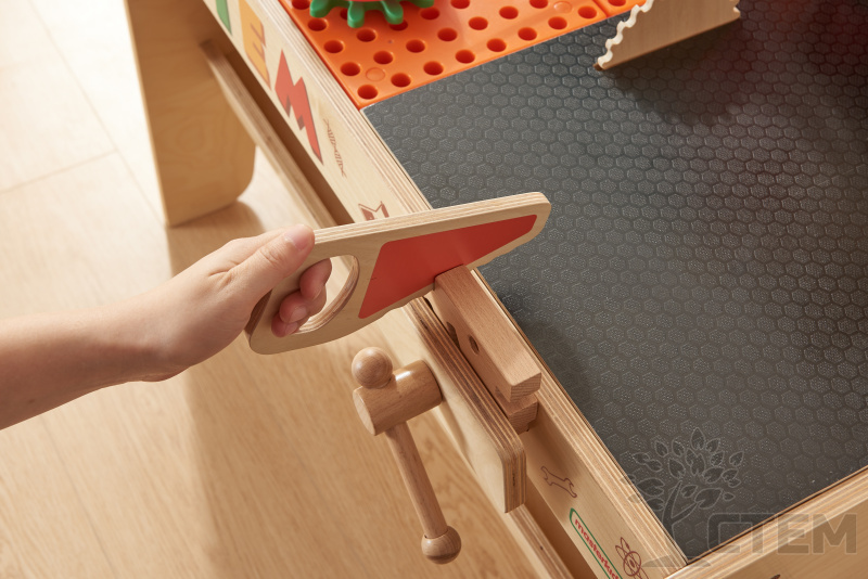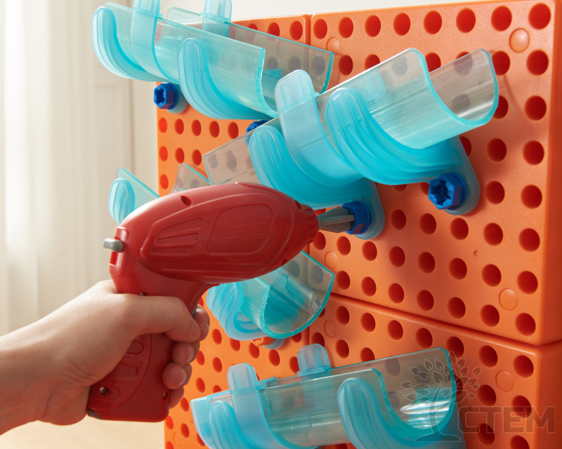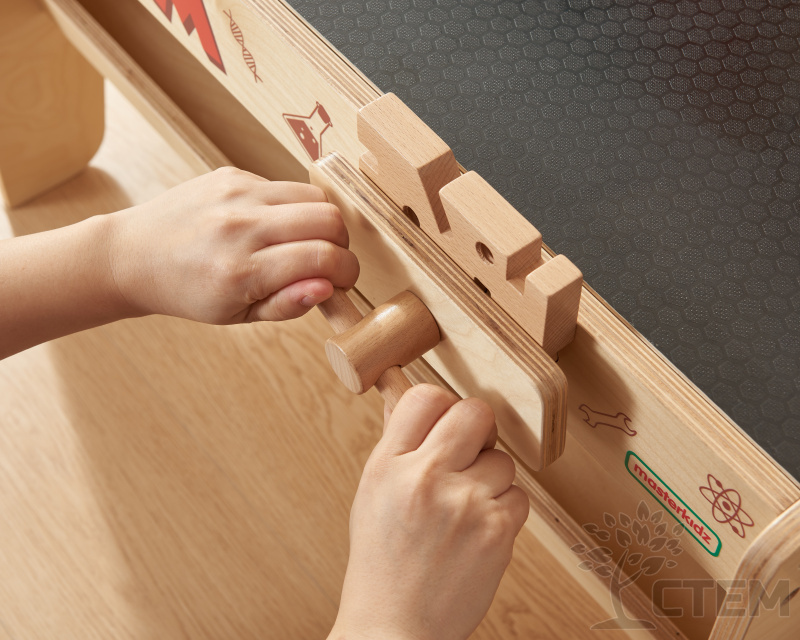 Детская мастерская изготовлена из прочных и экологичных материалов, вмещает все необходимые инструменты (пила, шуроповерт с насадками, винты, гвоздодер, молоток, гаечный ключ). В верхней и боковой частях стола имеются сквозные отверстия для вкручивания винтов, шестеренок и крепления различных пособий, что позволяет задействовать в игровом процессе сразу несколько детей. В комплекте идут панели с отверстиями, есть возможность дополнительной установки развивающих пособий Masterkidz, таких как (колышки, сокровища, кинетические треки). Пособия приобретаются отдельно. Все предметы выглядят реалистично, благодаря чему игровой набор вызовет восторг у детей!