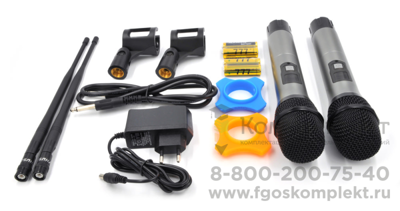 Инфракрасный порт для программирования. В комплекте поставки находятся (уточняйте при заказе) приемник, 2 ручных микрофона, кабель jack-jack, адаптер питания 12 В, батарейки AA 1,5В-4 шт, руководство пользователя, держатель микрофона—2 шт, силиконовое кольцо—2 шт.