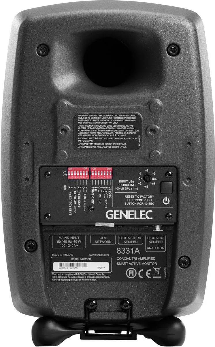 Genelec 8331AP активный 3-полосный коаксиальный монитор ближнего поля. 2 овальных НЧ 5.5"x3" 72Вт, коаксиальный СЧ 3.5" 36Вт+ВЧ 0.75" 36Вт. Подставки. Поддержка GLM калибратора. Вход: аналог. XLR, вх/вых цифр. XLR (AES/EBU), 2xRJ45 для работы с GLM системой. Макс. SPL 104 дБ, 45Гц-37кГц (±6 дБ). Кроссовер: 500Гц, 3кГц. Габариты (ВхШхГ): 305х189х212мм (с подставками). Вес 6.7кг. Темный
