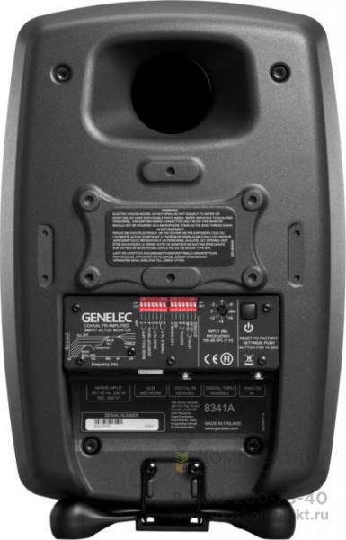 Genelec 8341AP активный 3-полосный коаксиальный монитор ближнего поля. 2 овальных НЧ 7"x4" 250Вт, СЧ коаксиальный 3.5" 150Вт+ВЧ 0.75" 150Вт. Подставки. Поддержка GLM калибратора. Вход: аналог. XLR, вх/вых цифр. XLR (AES/EBU), 2xRJ45 для работы с GLM системой. Макс. SPL 110 дБ, 38Гц-37кГц (±6 дБ). Кроссовер: 500Гц, 3кГц. Габариты (ВхШхГ): 370х237х243мм (с подставками). Вес 9.8кг. Темный