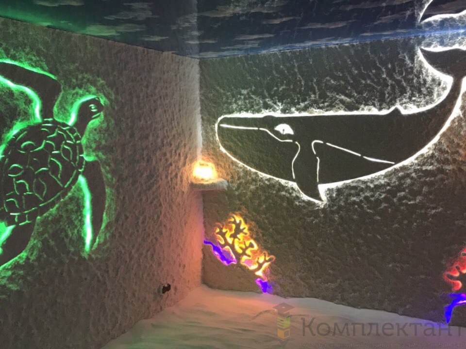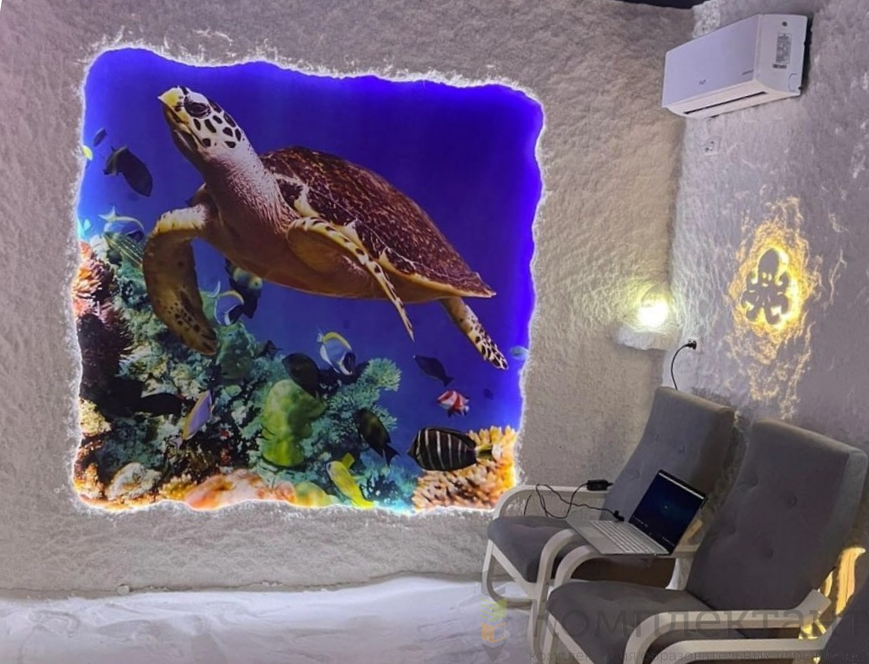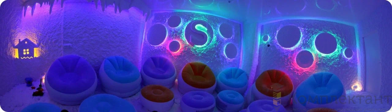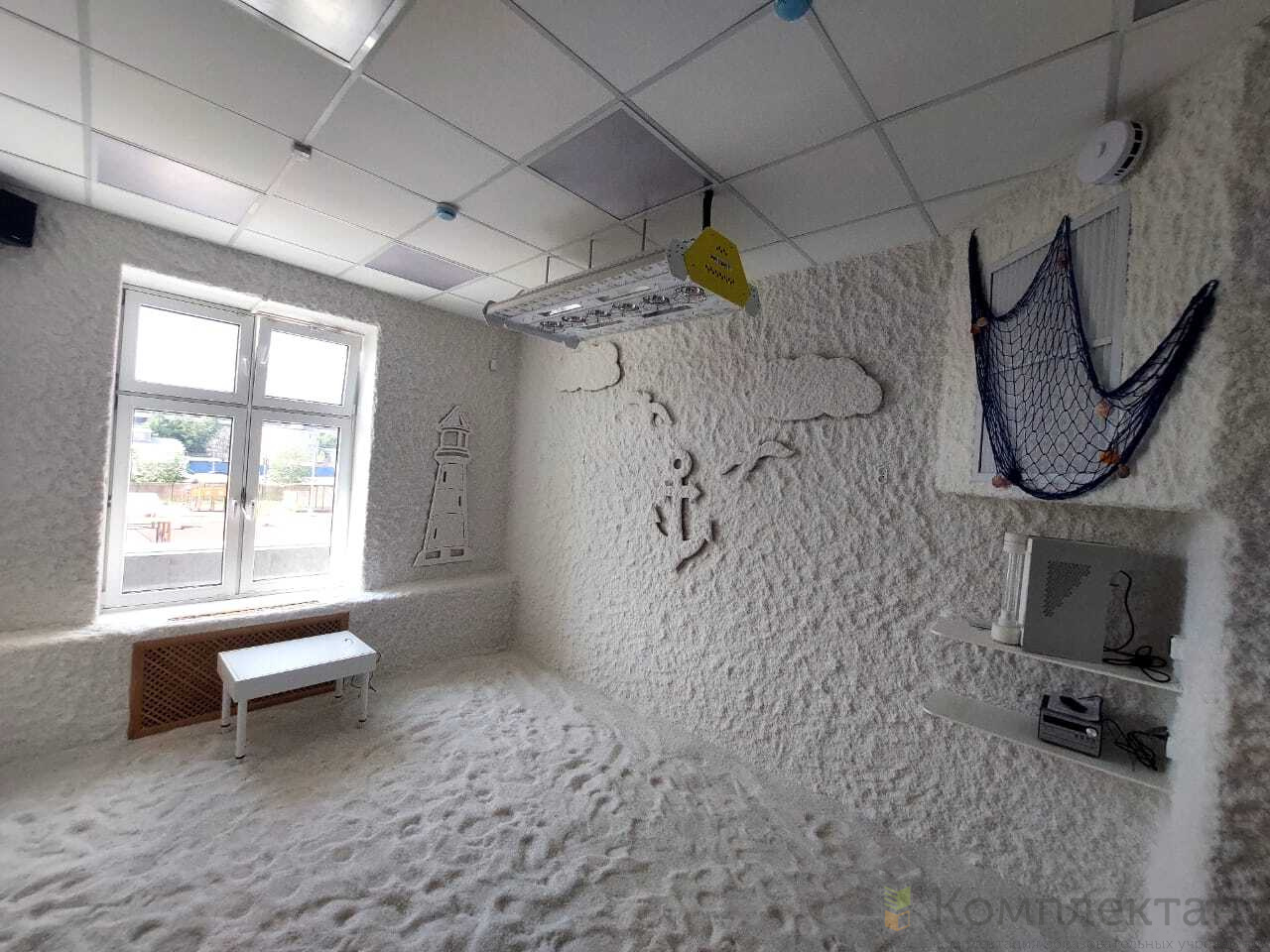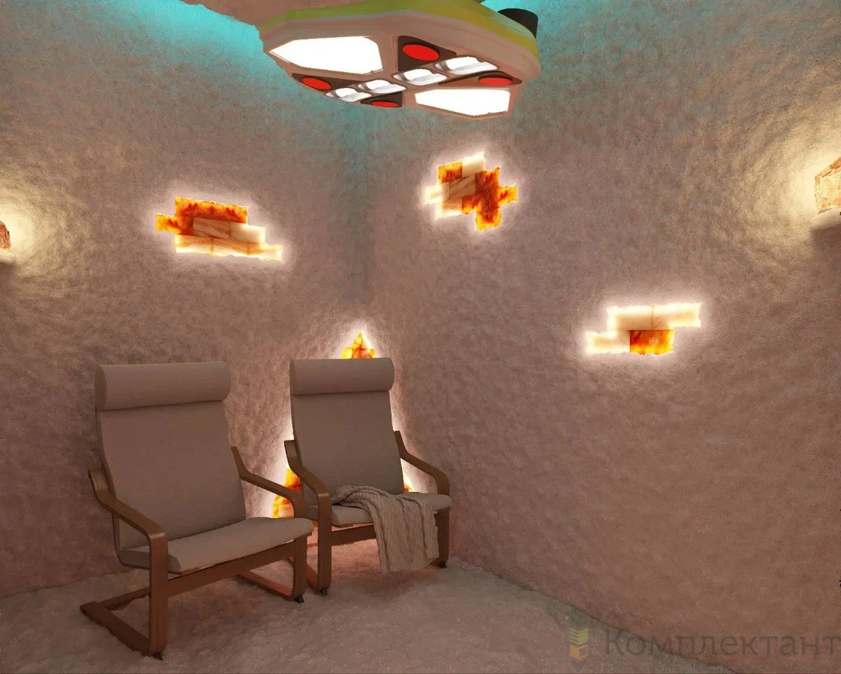 Аэрогалитгенератор Galotech для помещений до 80 куб.м; Работает по принципу «сухого кипения» на препарате «Аэрогалит», 1 пакетик на 1 сеанс; подключение и наладка оборудования, обучение техничесого персонала на месте; оформление помещения на выбранную тематику; оформление стен и пола в помещении пещеры; световое оформление комплекса и электротехнические работы; монтаж вентиляторов; стройматериалы для монтажа галодизайна, соль для нанесения на стены; Аудиосистема с 2 колонками (или телевизор с кронштейном, по желанию), столик.