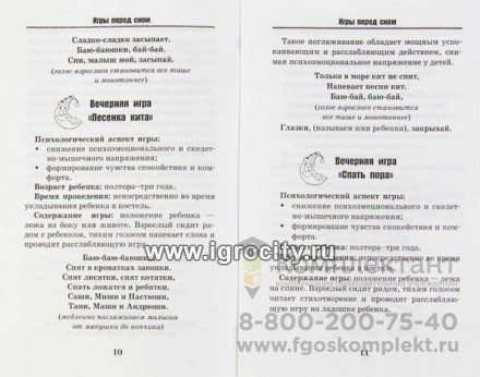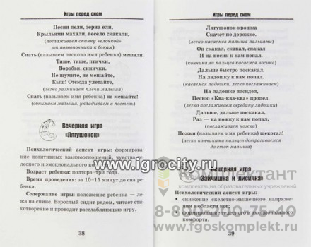 Чтобы обеспечить ребенку здоровый и полноценный сон, родителям необходимо сформировать у малыша предпосылки «сонного торможения», желание идти спать, быстрое засыпание и спокойный ночной сон С возрастом режим сна у детей меняется, и родители могут столкнуться с проблемой, как уложить свое чадо вовремя спать. В книге собраны рекомендации и практический материал, позволяющие родителям снизить негативный настрой малыша к ситуации «пора спать», а также сформировать позитивное отношение к этому режимному моменту. Игры перед сном Захотела мышка спать Песенка кита Спать пора Укладывает зайчика спать Сова Начинаем рисовать Индюк Мышки готовятся спать Сторож Мушка Кто уснул? Мышки-шалунишки Башмачок Песенка совы На лугу Котик Котофей Подружки Рисунок Муравьишка Осьминог Паровозик Стелем постель Прилетели птички Для каждой игры описаны Психологический аспект игры Возраст ребенка Время проведения Содержание игры Вечерняя игра "Кто уснул" Психологический аспект игры: Снижение скелетно-мышечных зажимов в области лица снижение психоэмоционального напряжения Возраст ребенка 2-3 года Время проведения За 5-7 минут до сна ребенка Содержание игры: Положение ребенка лежа на спине. Взрослый читает стихотворение и проводит расслабляющую игру-массаж. Кто в пушистый ком свернулся Носом в хвост себе уткнулся? (легко поглаживаем крылья носика малыша) Это хитрая лисичка, Спит в норе своей сестричка Легко поглаживаем лоб малыша по направлению от середины к вискам, затем медленно по часовой стрелке поглаживаем область между бровями) Рядом спят ее лисятки Рыжехвостые ребятки (легко поглаживаем мочки ушей, затем всю ушную раковин) Снятся им не шоколадки, А хвостатые мышатки. (поглаживаем волосистую часть головы)