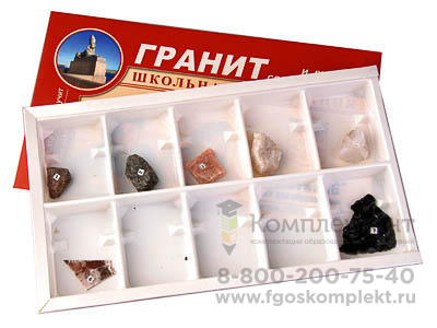 Состав коллекции: гранит красный, гранит серый, полевой шпат розовый, полевой шпат серый, кварц, слюда мусковит, слюда биотит.