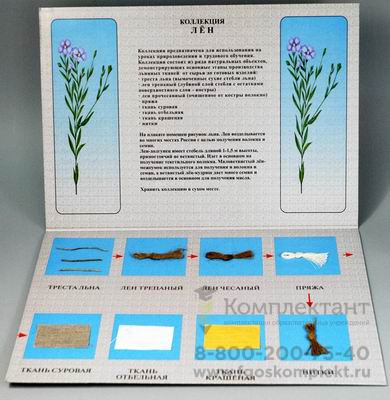 В коллекции представлены натуральные образцы, характеризующие процесс производства льняных тканей от исходного сырья - тресты льняной до готовых тканей. Коллекция используется в качестве демонстрационного материала. Коллекция упакована в термоусадочную прозрачную плёнку.