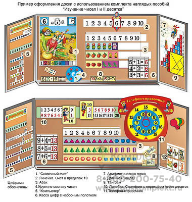 Комплект наглядных пособий изготовлен из картона и полиэтилена и состоит из следующих пособий: 1. Сказочный счет (10 листов, 430*580 мм). 2. Линейка. Счет от 1 до 10. 3. Абак с предметными картинками и геометрическими телами и фигурами. 4. Круги по составу чисел первого десятка. 5. «Компьютер». 6. Касса цифр с наборным полотном. 7. Числовая горка. 8. Домино (3 вида). 9. Танграм. 10. Линейка. Счет от 1 до 20. 11. Телефон-справочник.
