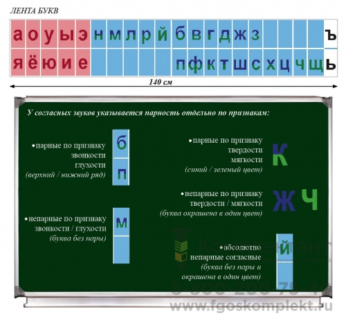 «Лента букв» иллюстрирует основные понятия из области фонетики: «звук в сопоставлении с буквой»; гласные и согласные звуки; согласные звуки мягкие и твердые, парные и непарные, глухие и звонкие; гласные, обозначающие твердость и мягкость согласных