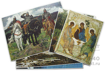 Пособие представляет собой набор репродукций картин русских художников, изготовленных на плотной небликующей бумаге, предназначенный для уроков МХК, изобразительного искусства или занятий по развитию речи в рамках уроков русского языка. В состав пособия включены репродукции картин художников: И.К. Айвазовского, К.П. Брюллова, В.М. Васнецова, М.А. Врубеля, А.А. Иванова, А.И. Куинджи, И.И. Левитана, В.Г. Перова, Н.К. Рериха, А. Рублева, А.К. Саврасова, П.А. Федотова, И.Ф. Хруцкого, И.И. Шишкина.