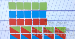 В коробке: 5 больших карточек 7 см х 10,5 см (для обозначения слога с гласной и мягкой согласной) 5 больших карточек 7 см х 10,5 см (для обозначения слога с гласной и твёрдой согласной) По пять карточек 7cм х 7 см красного, синего и зелёного цветов для фонетического обозначения отдельных букв или слогов с одной гласной.