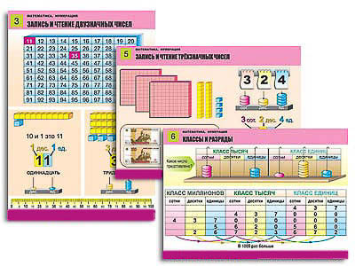 Таблицы: 1. Нумерация чисел в пределах 10. 2. Десяток. Счёт десятками. 3. Запись и чтение двузначных чисел. 4. Сотня. Счёт сотнями. Запись и название "круглых" сотен. 5. Запись и чтение трёхзначных чисел. 6. Классы и разряды. 7. Представление числа в виде суммы разрядных слагаемых. 8. Сравнение многозначных чисел.